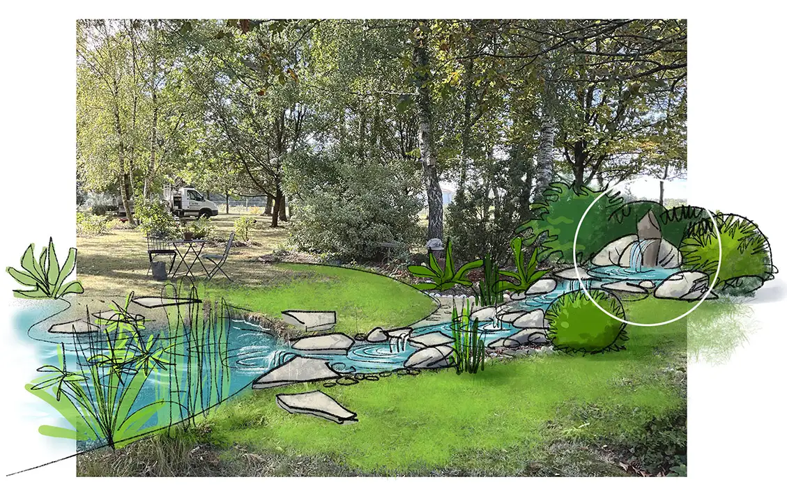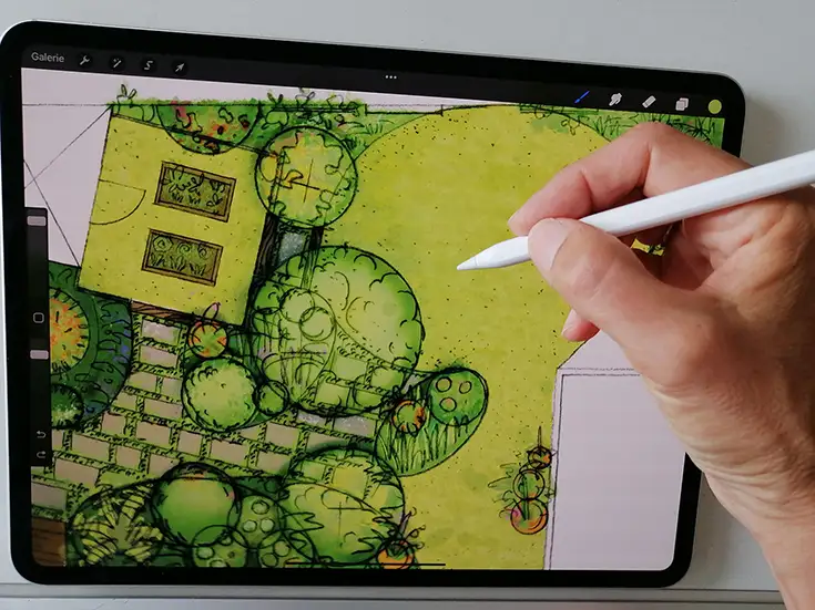 Sur place et avec vous, je vais dessiner le plan d’ensemble de votre projet paysager sur une tablette graphique, afin que vous ayez immédiatement un aperçu du résultat et que vous puissiez dès ce moment préciser vos envies.