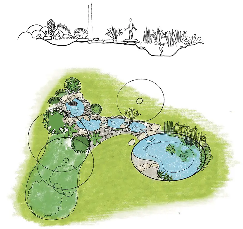 rapidement, structurer les différents espaces de votre jardin suivant leurs fonctionnalités (lieu de détente, repas, espace de jeux..), déterminer les transitions et les circulations (allées, sentiers…), implanter les végétaux majeurs… Nous allons valider les grandes lignes de votre jardin pour que vous restiez l’acteur de votre projet paysager.