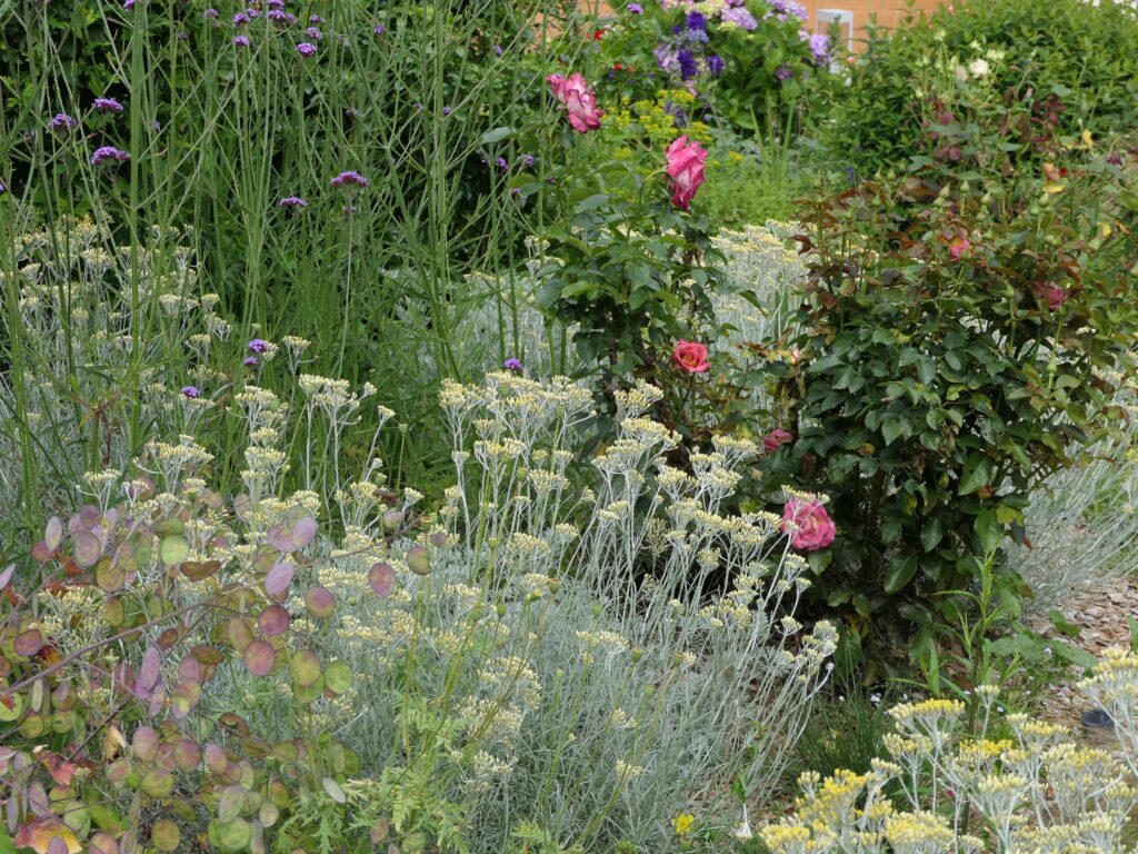 La monnaie du pape (lunaria annua) se marie à merveille avec les couleurs de l’Helichysum et le rosier rose